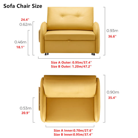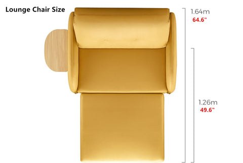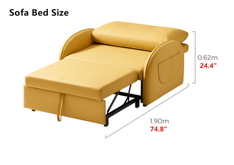 • sofa chair size: 0.95m/1.2m W X 0.9m D  X 0.93m H(37.4"/47.2"X35.4"X36.6"). The length of lounge chair is 1.64M/64.6". The length of sofa bed is 1.9M/74.8"