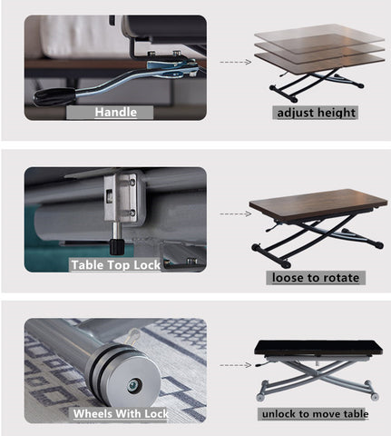 • 【Foldable & Rotatable & Liftable 】 The surface is made of wood while the frame is made of metal. There is a handle under the surface for adjusting the leg height. The adjustment lever works with a pneumatic action so it is easier to raise the surface than lower it.