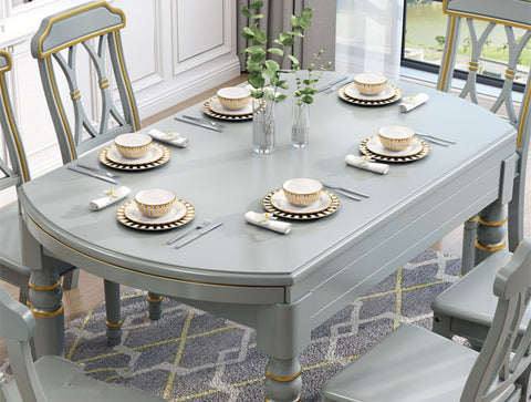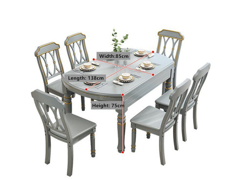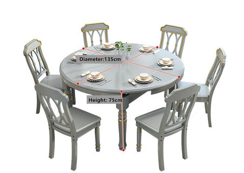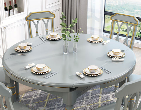 • 7 piece dinette Set Includes a 2 in 1 round/square dining table and 6 dining chairs.
